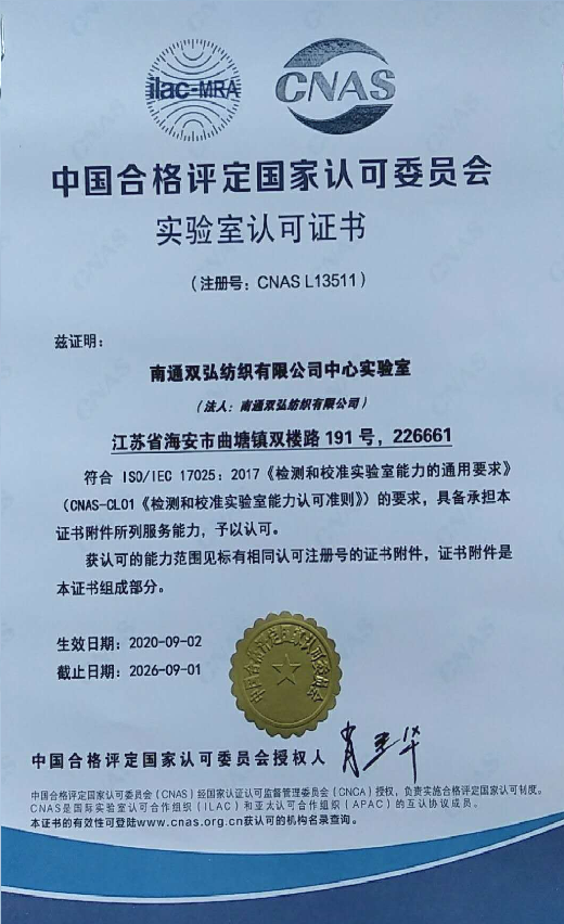 Nedávno centrálne laboratórium Nantong Double Great Textile Co., Ltd. úspešne získalo akreditáciu z Číny akreditačnej služby na hodnotenie zhody (CNA) a získal certifikát. Toto je ďalšia hodnotná kvalifikácia, ktorú laboratórium získalo po tom, čo sa stalo platformou testovacej priadze Čínskej asociácie textilu bavlny. Centrálne laboratórium spoločnosti Double Great Company sa tiež stalo jedným z pokročilých laboratórií vynikajúcich podnikov na točenie bavlny v krajine.
