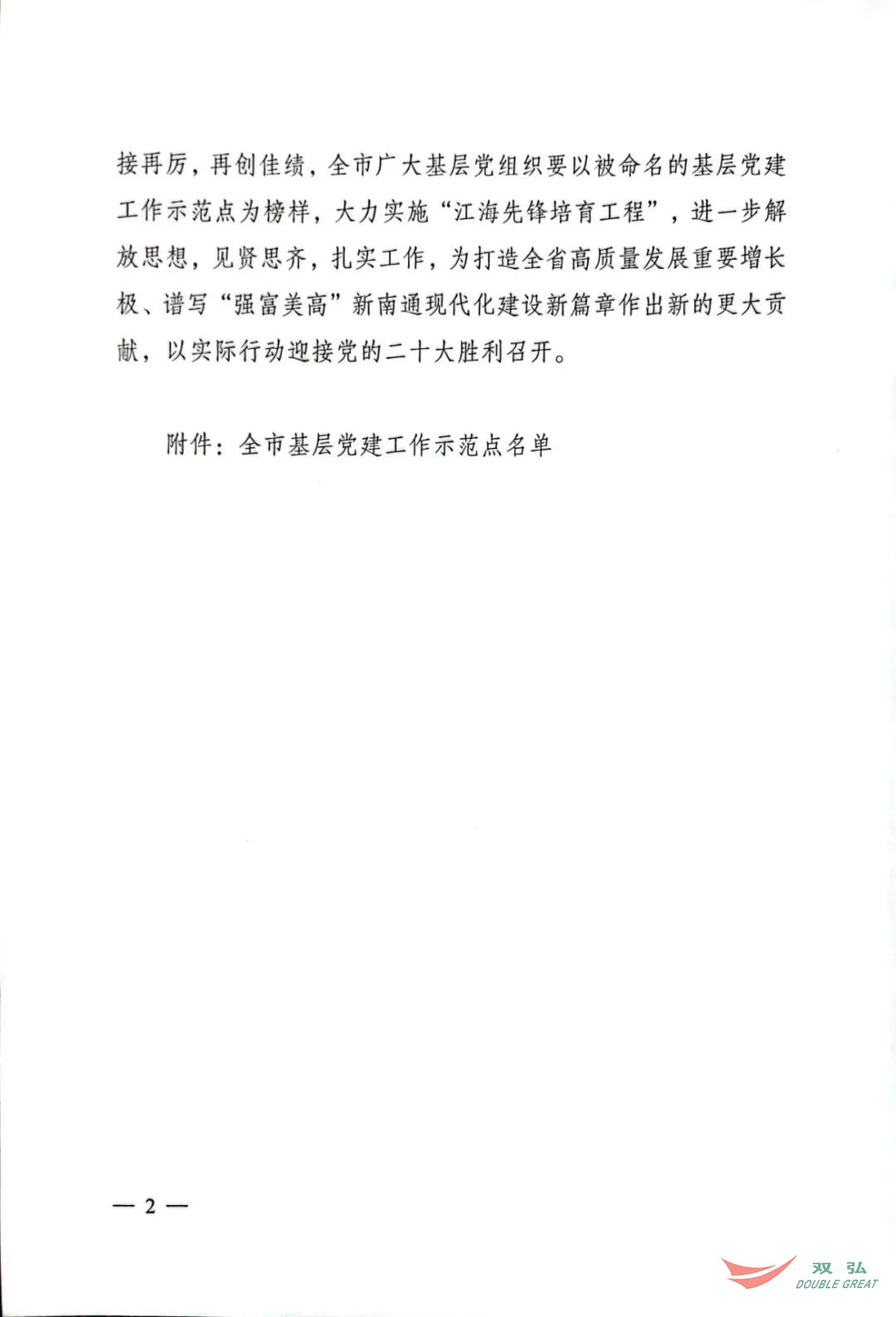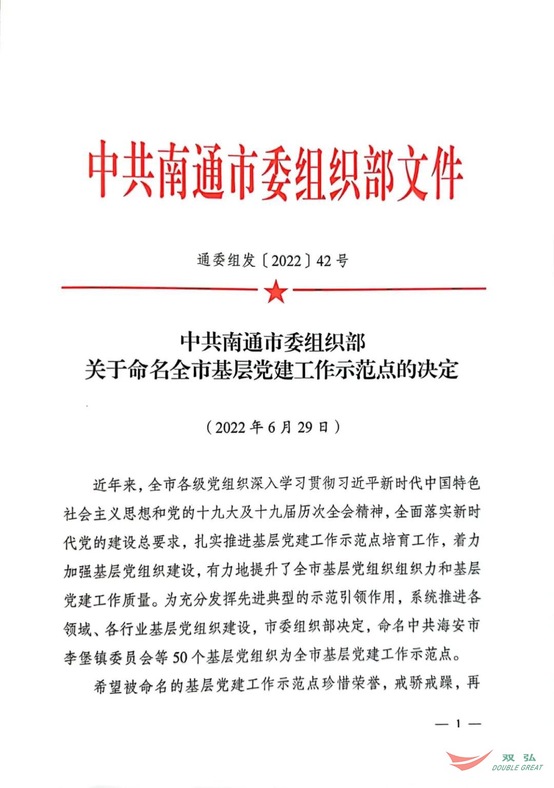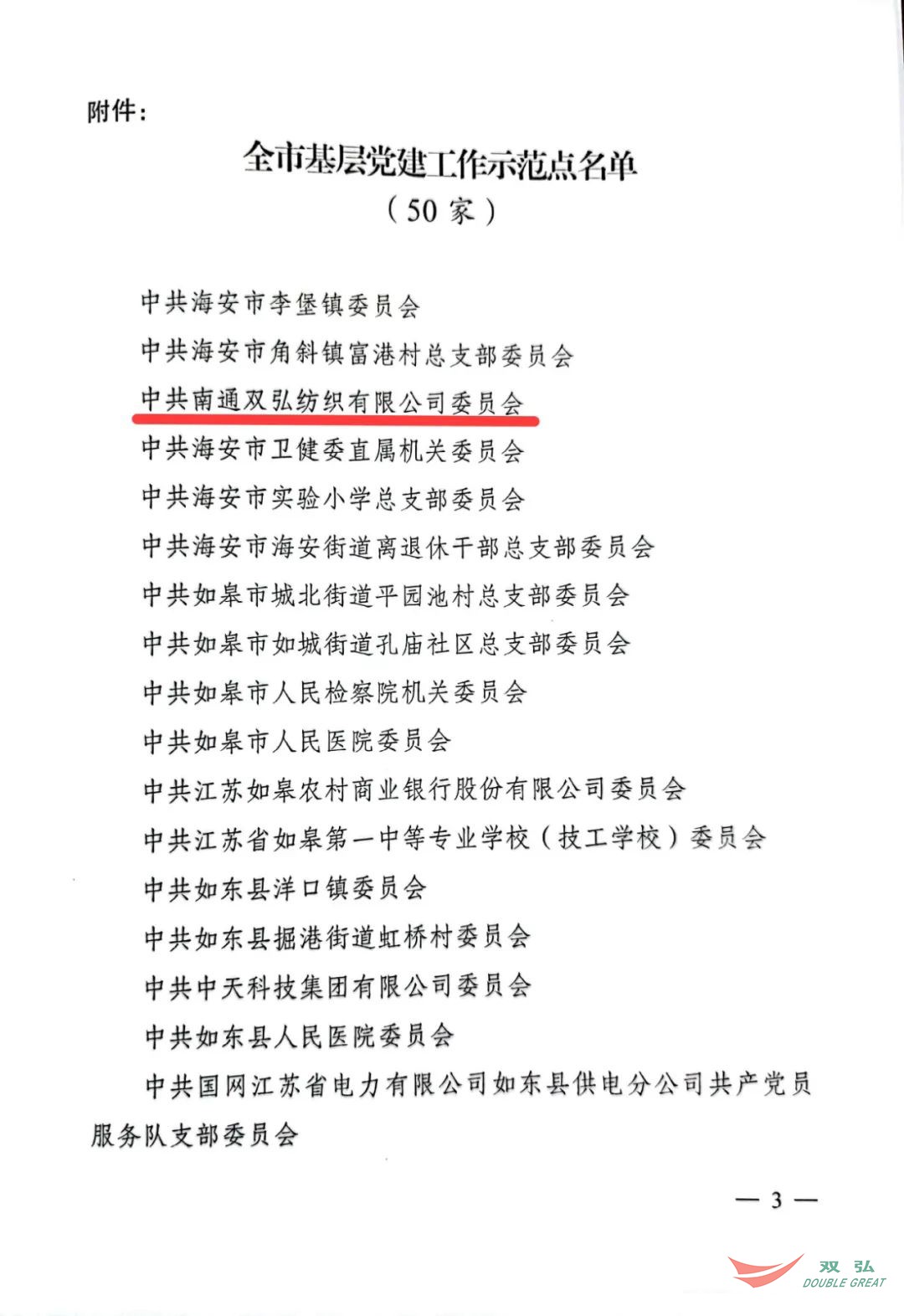 Organizačné oddelenie mestského výboru CPC Nantong vydalo dokument, v ktorom pomenujú 50 organizácií na miestnej strany ako mestské demonštračné miesta na miestnej úrovni. Výbor pre stranu Nantong Double Great Textile Co., Ltd. bol udelený titul „Demonštračná stránka mestskej miestnej strany“.